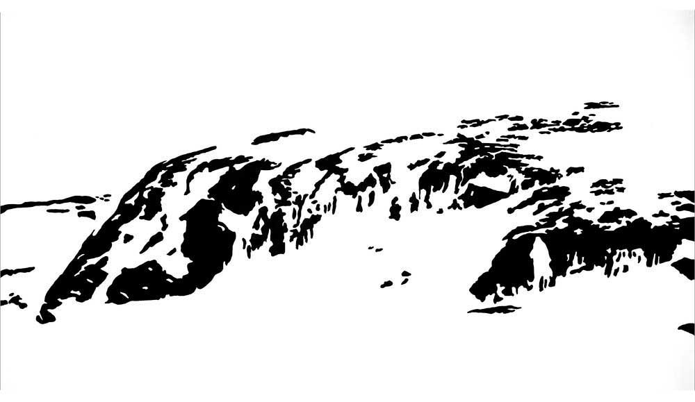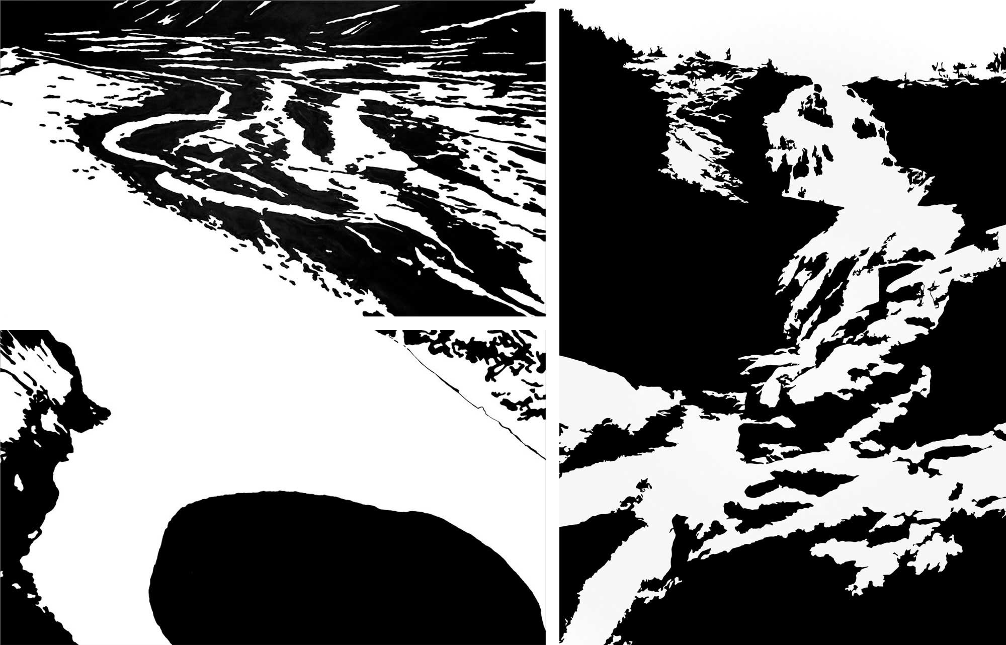 This work marks a move to a further level of abstraction than earlier works and it reflects a desire to reveal the bare essence or underlying spirit of places that are somewhat “unplaceable”. In the actual scenes, rock, snow and sky merge into seamless, flat vistas. In this work, land, horizon and scale are rendered as ambiguous, two-dimensional patterns. While totally realistic, these pared down images take on a mysterious, Rorschach-like quality. What remains are only the essential elements of each scene: the extremes of white and black. An unknown landscape in an unknown place.